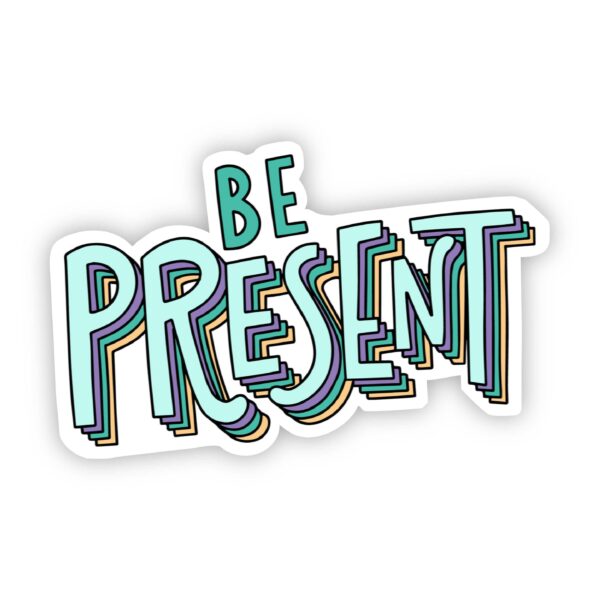 Be Present Teal Lettering Sticker. Great to decorate water bottles, laptops, phone cases, coolers, car windows, journals, notebooks, planners, bikes, skateboards, kayaks, and more. This sticker is a part of our positivity collection and makes a great gift!