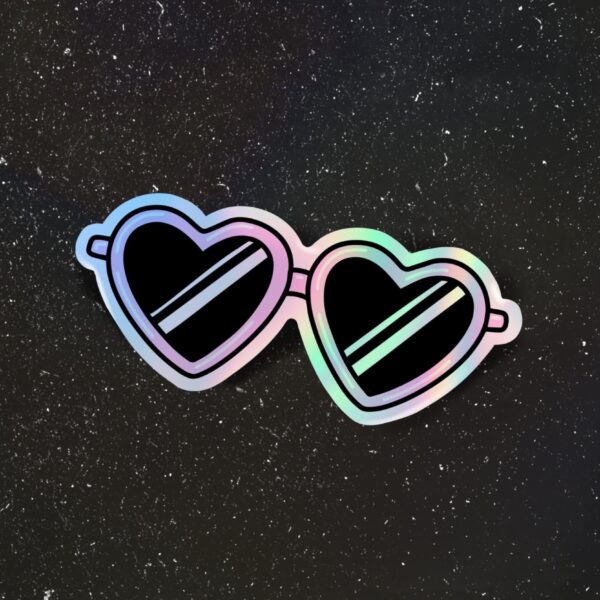 Heart Sunglasses Holographic Sticker. Great to decorate water bottles, laptops, phone cases, coolers, car windows, journals, notebooks, planners, bikes, skateboards, kayaks, and more. This sticker is apart of our Holographic Sticker Collection.