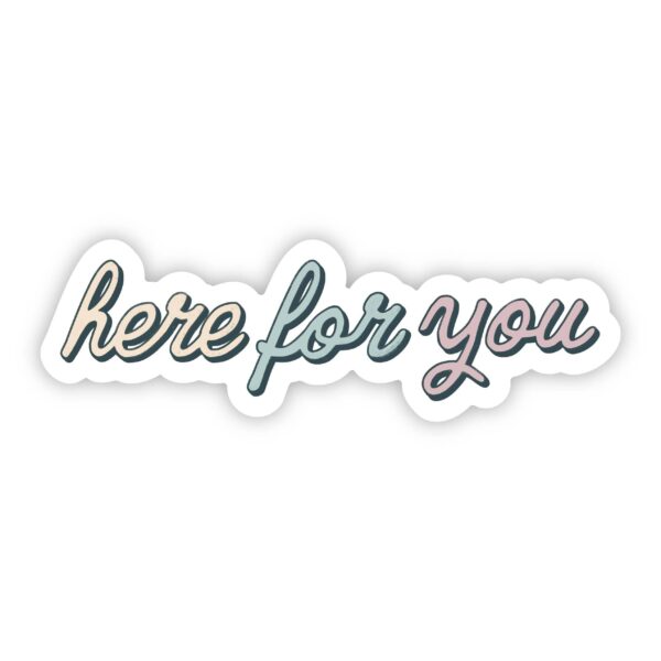 Here for You Mental Health Sticker. Great to decorate water bottles, laptops, phone cases, coolers, car windows, journals, notebooks, planners, bikes, skateboards, kayaks, and more. This sticker is apart of our Mental Health Collection and serves as a great reminder to take care of your mental well being!