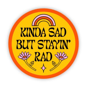 High quality vinyl sticker. Great to decorate laptops, water bottles, car windows, coolers, phone cases, journals, suitcases, and more. This sticker is part of our mental health sticker collection. Positive and uplifting design. Colors: Black and Yellow. Style: Retro and Vibrant, Rainbow.