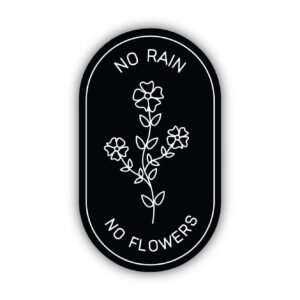 No Rain No Flowers Black Sticker. Great to decorate water bottles, laptops, phone cases, coolers, car windows, journals, notebooks, planners, bikes, skateboards, kayaks, and more.