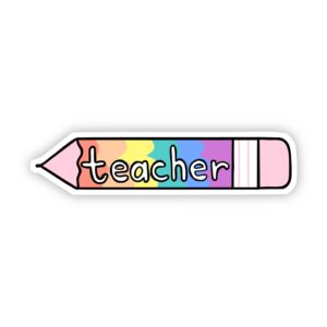 Teacher Rainbow Pencil Sticker. Great to decorate water bottles, laptops, phone cases, coolers, car windows, journals, notebooks, planners, bikes, skateboards, kayaks, and more. This sticker makes a great gift for anyone who is a teacher or has a teacher in their life.