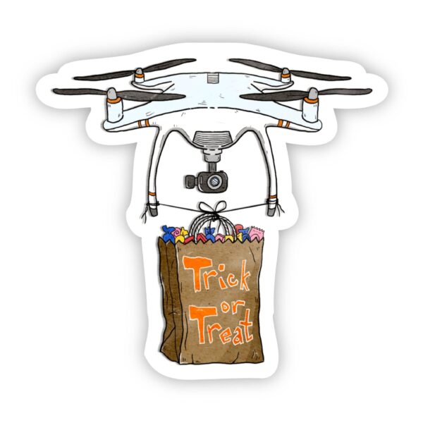 Trick or Treat Drone Halloween Sticker. Great to decorate water bottles, laptops, phone cases, coolers, car windows, journals, notebooks, planners, bikes, skateboards, kayaks, and more. This sticker is great for any person who loves Halloween!